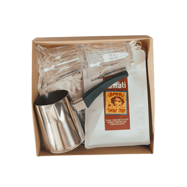 ערכה להכנת קפה ישראלי הכוללת פינג'ן נירוסטה, 250 גרם תערובת עפרה איכותית וטרייה, 2 כוסות זכוכית.